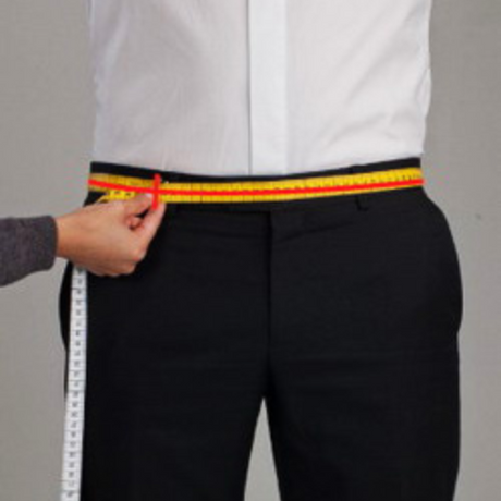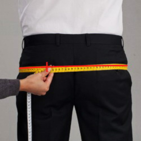 Place the measuring tape at the center top of the waistband in the front, then take it around in a "U" shape to the center top of the waistband at the back.